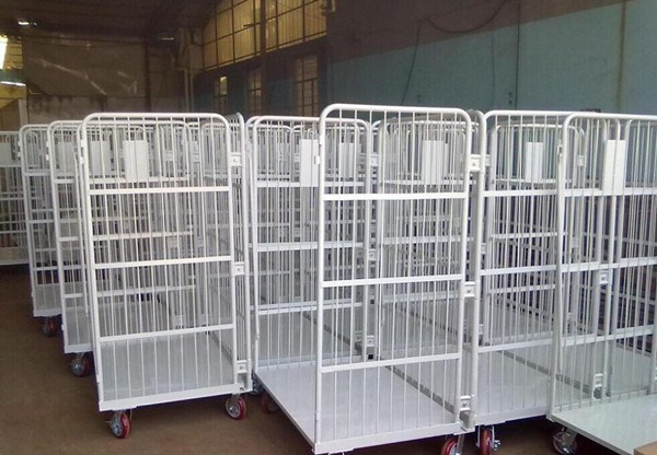 This roll container's components: L type door, folded door, baseboard, castors and bracing. The material for base frame is high-quality carbon steel pipe and the size is: 20*30*2.0. The baseboard is mesh resin board. The baseboard is equipped with four Φ25 round tubes, enhance the strength for the whole baseboard. Two directional wheels and two universal wheels with brake are under the baseboard; L type door and folded door's frame are bened by Φ25 round tube. bracing connect left and right parts together tight, guaranteed overall stability.